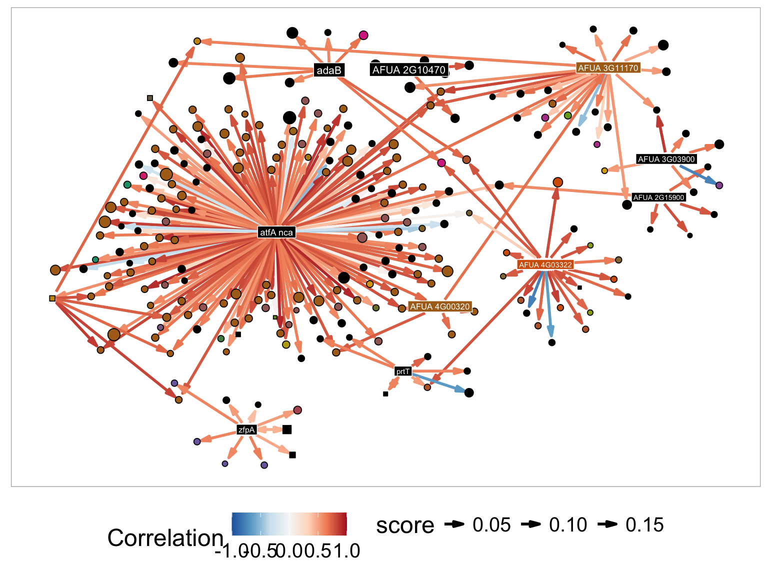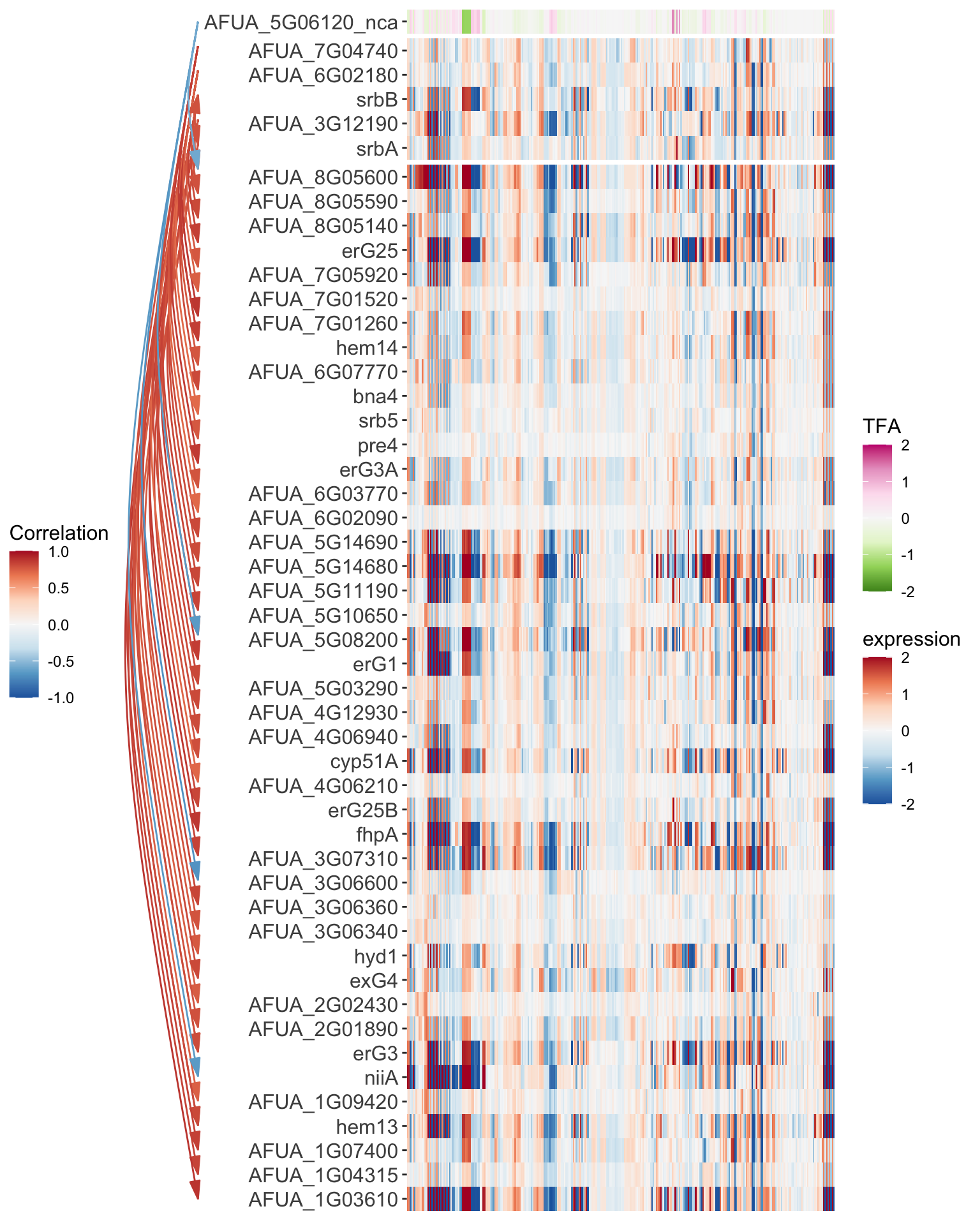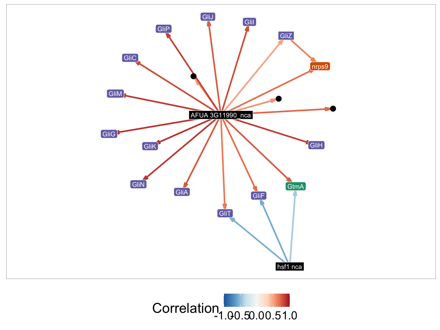 The figure above is colored so that nodes within the same module are all the same color. It is possible to have regulators that are in other modules (such as AFUA_3G12190) which is a second module, or that are not assigned to any module (such as AFUA_5G06120_nca, which are colored black). Genes with the suffix nca indicate transcription factor activity profiles (TFA) of a gene, instead of a the gene expression profiles. These TFA profiles are informed by motif information and candidate target gene expression profiles. In practice, regulatory relationship between TFA profiles and expression profiles are both indicative of transcriptional regulation.