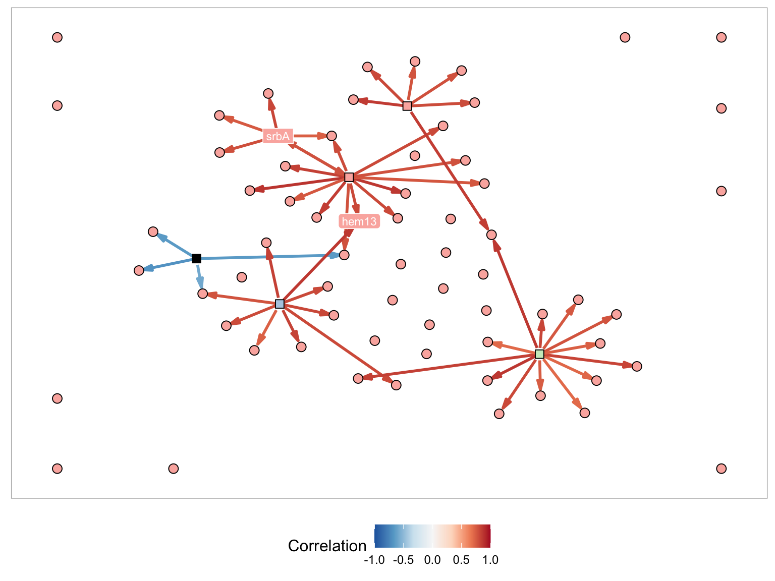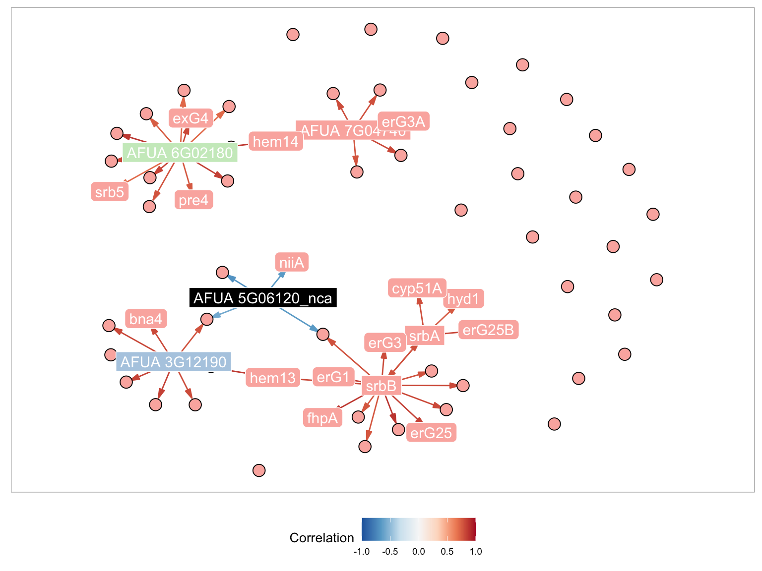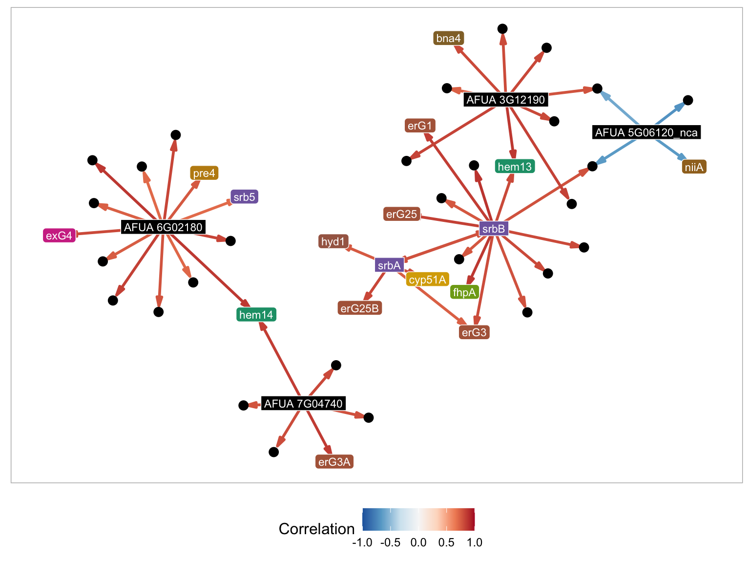 Utilizing the following setting reproduces the figure 3B. of the paper. - Node Layout - Davidson-Harel - Minimum number of genes in component - 2 (removes modules genes without confident regulators) - Display gene names - cyp51A, erG25B, hyd1, srbA, srbB, erG3, erG25, fhpA, erG1, hem13, niiA, AFUA_5G06120_nca, AFUA_3G12190, bna4, srb5, hem14, exG4, erG3A, pre4, AFUA_7G04740, AFUA_6G02180 - Name in node - Selected - Node color by - Gene Name - Node color palette- Dark2 - Edge color by - Correlation - Edge color palette - RdBu