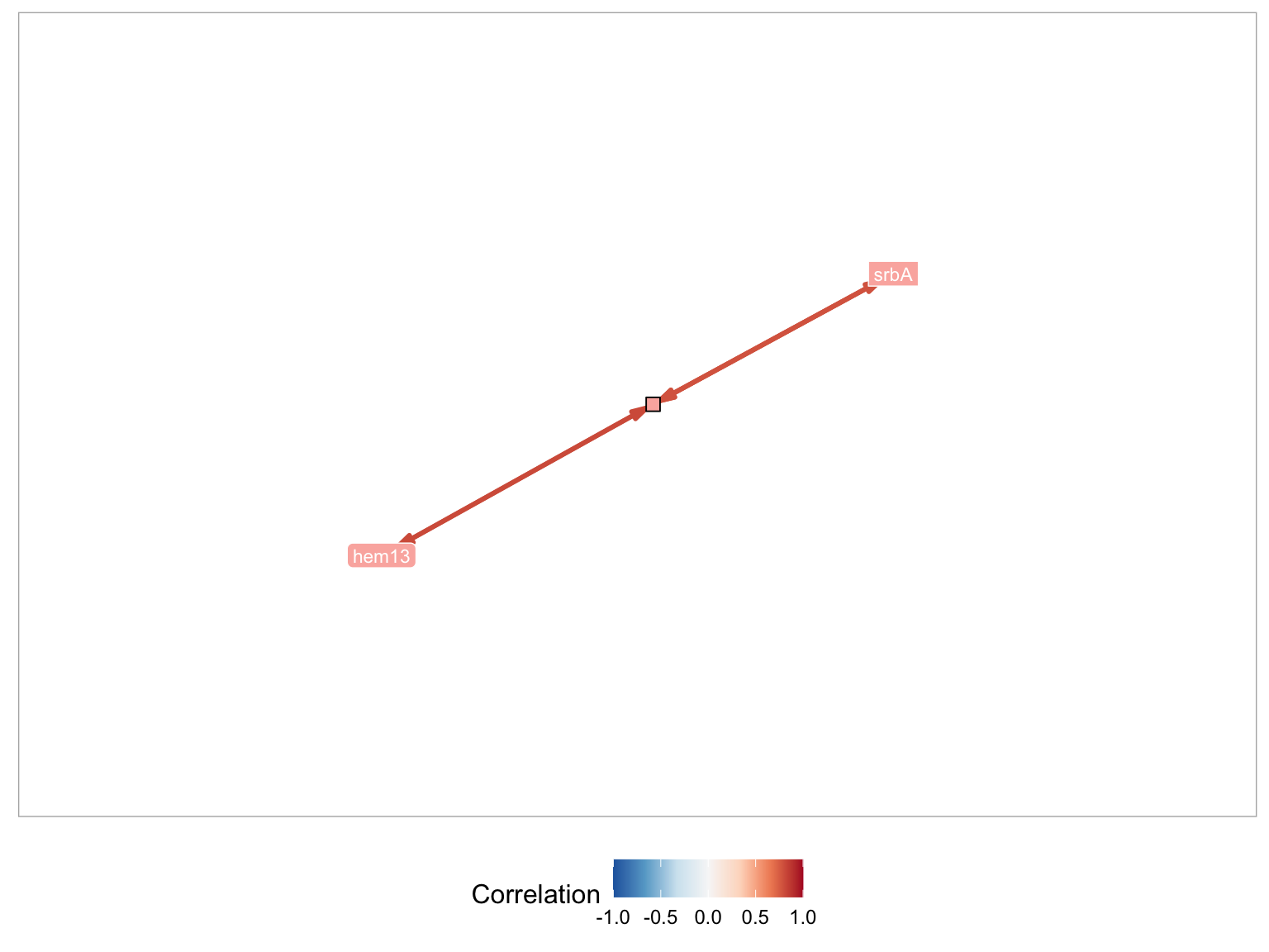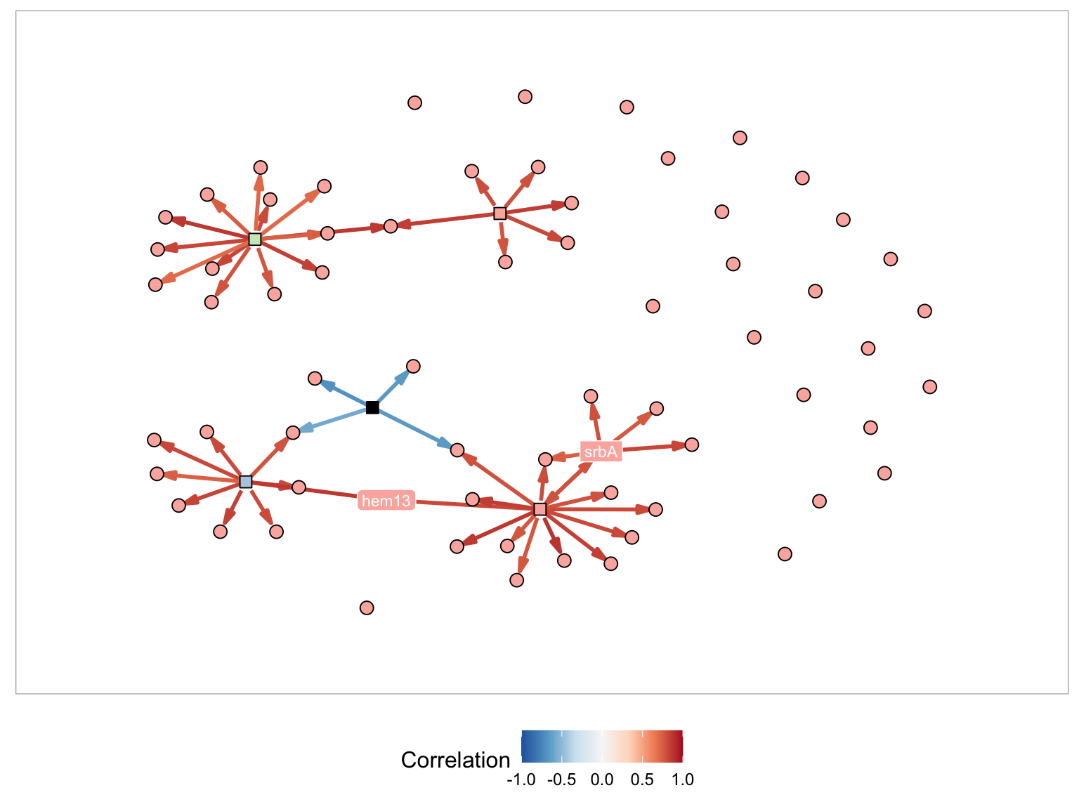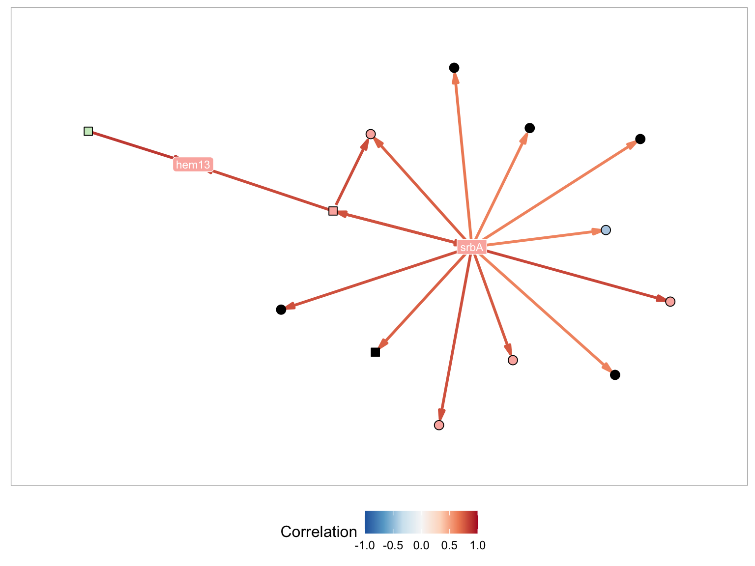 Utilizing the following setting reproduces the figure 3B. of the paper. - Node Layout - Davidson-Harel - Minimum number of genes in component - 2 (removes modules genes without confident regulators) - Display gene names - cyp51A, erG25B, hyd1, srbA, srbB, erG3, erG25, fhpA, erG1, hem13, niiA, AFUA_5G06120_nca, AFUA_3G12190, bna4, srb5, hem14, exG4, erG3A, pre4, AFUA_7G04740, AFUA_6G02180 - Name in node - Selected - Node color by - Gene Name - Node color palette- Dark2 - Edge color by - Correlation - Edge color palette - RdBu